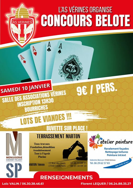 Concours de Belote + Ajouter à mon Agenda Google + iCal / Outlook export 00 jours 00 heures 00 minutes 00 secondes janvier 2026 Jan 10 2026 Concours de Belote Maison des Associations Jan 17 2026 AG « Bougez contre la SLA » Maison des Associations Jan 24 2026 AG « Les Ainés Ruraux » Maison des Associations Pas d'événement actuellement programmé.