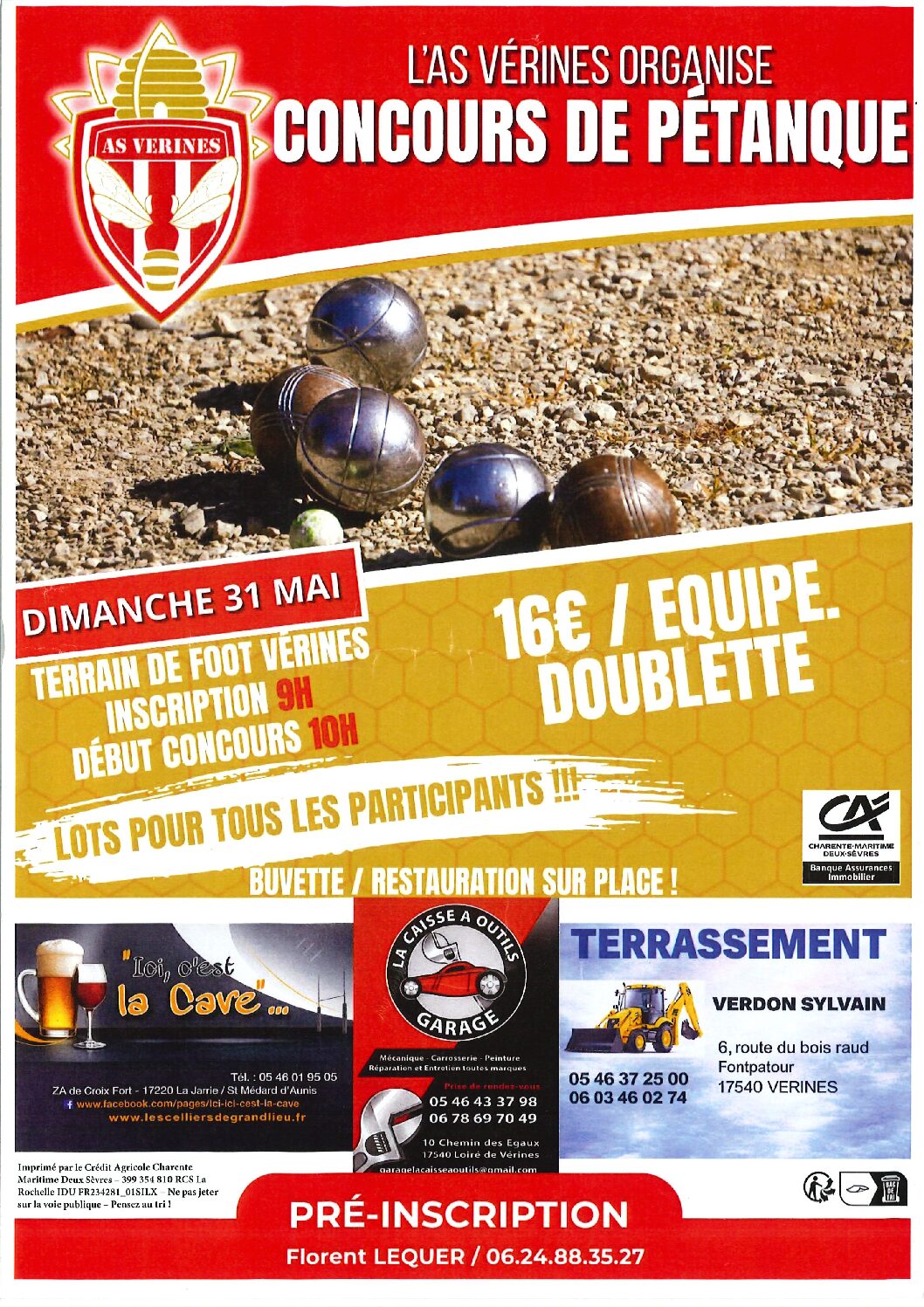 Concours de Pétanque + Ajouter à mon Agenda Google + iCal / Outlook export 00 jours 00 heures 00 minutes 00 secondes avril 2026 Avr 24 2026 Ouverture du Marché Hebdomadaire Clos Marchand Avr 25 2026 Concours de Belote Maison des Associations mai 2026 Mai 31 2026 Vide Grenier Terrain de football Mai 31 2026 Concours de Pétanque Terrain de football Pas d'événement actuellement programmé.