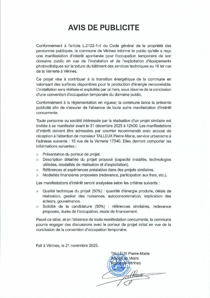 Conformément à l’article L.2122-1-4 du code général de la propriété des personnes publiques, la commune de Vérines informe le public qu’elle a reçu une manifestation d’intérêt spontanée pour l’occupation temporaire de son domaine public en vue de l’installation et de l’exploitation d’équipements photovoltaïques sur la toiture du bâtiment des services techniques au 16 ter rue de a Verrerie à Vérines…